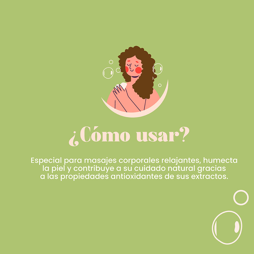 Aplicar diariamente después de la ducha, masajear con fuerza de forma circular y ascendente permitiendo que la piel lo absorba sus beneficios y se humecte con todas sus propiedades. No mancha ni engrasa la ropa.