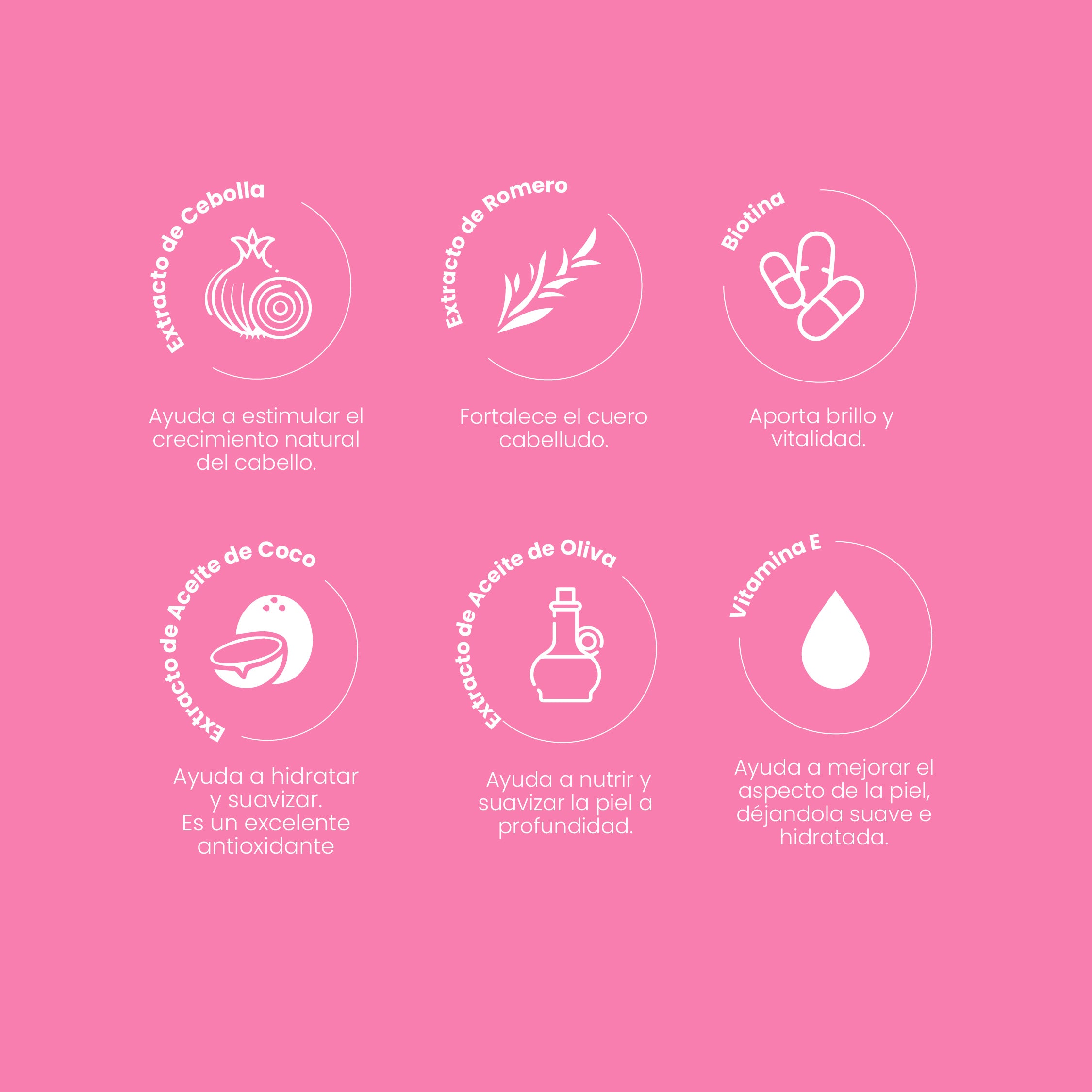 - Shampoo de Cebolla, romero y biotina: ayuda a estimular el crecimiento del cabello, hidrata y fortalece el cuero cabelludo, evitando la caída. Para todo tipo de cabello.