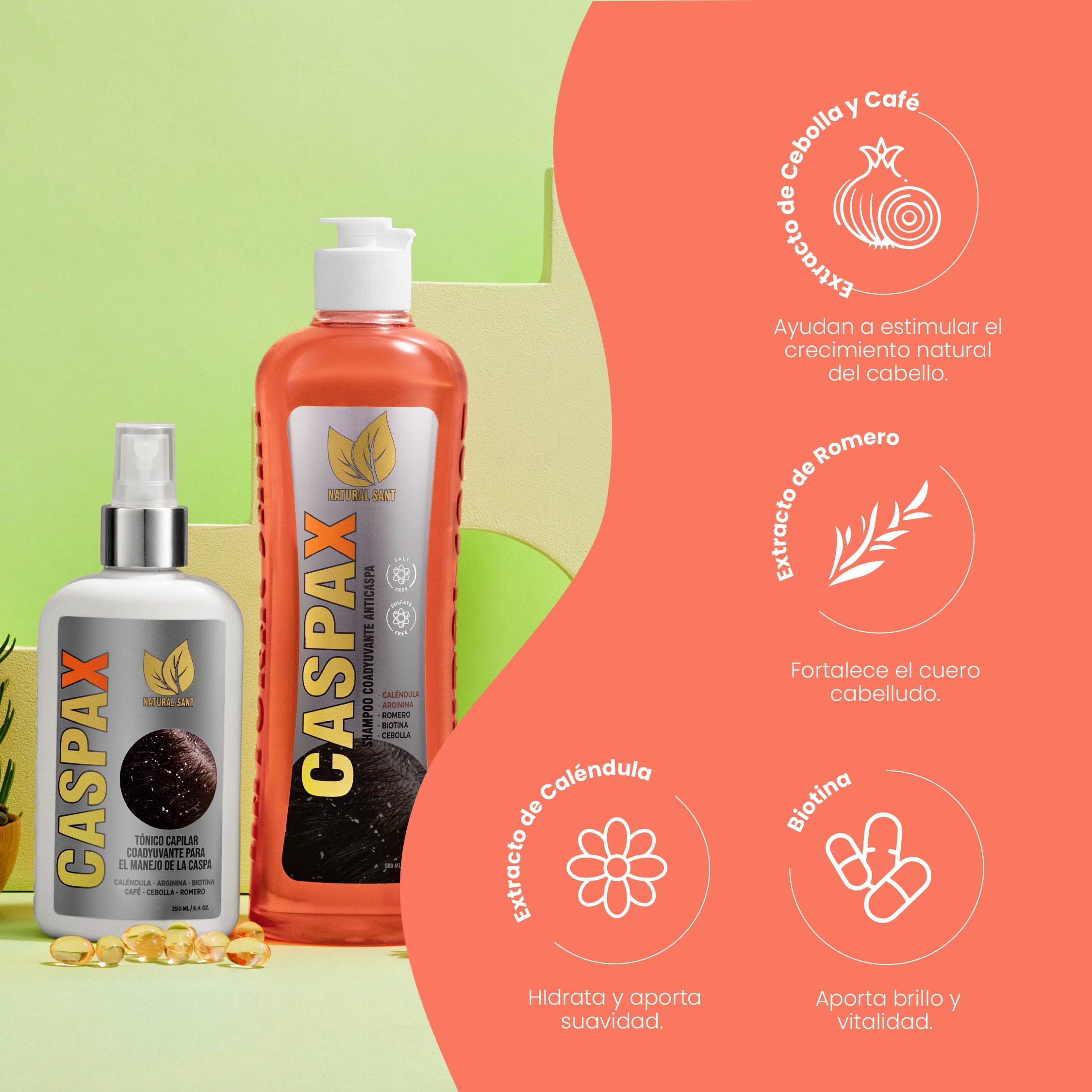Tónico: el tónico caspax gracias a sus extractos de cebolla, romero, biotina, arginina, café y caléndula es ideal para fortalecer y promover el crecimiento natural del cabello, además de ayudar con el manejo de la caspa y la sebo regulación.