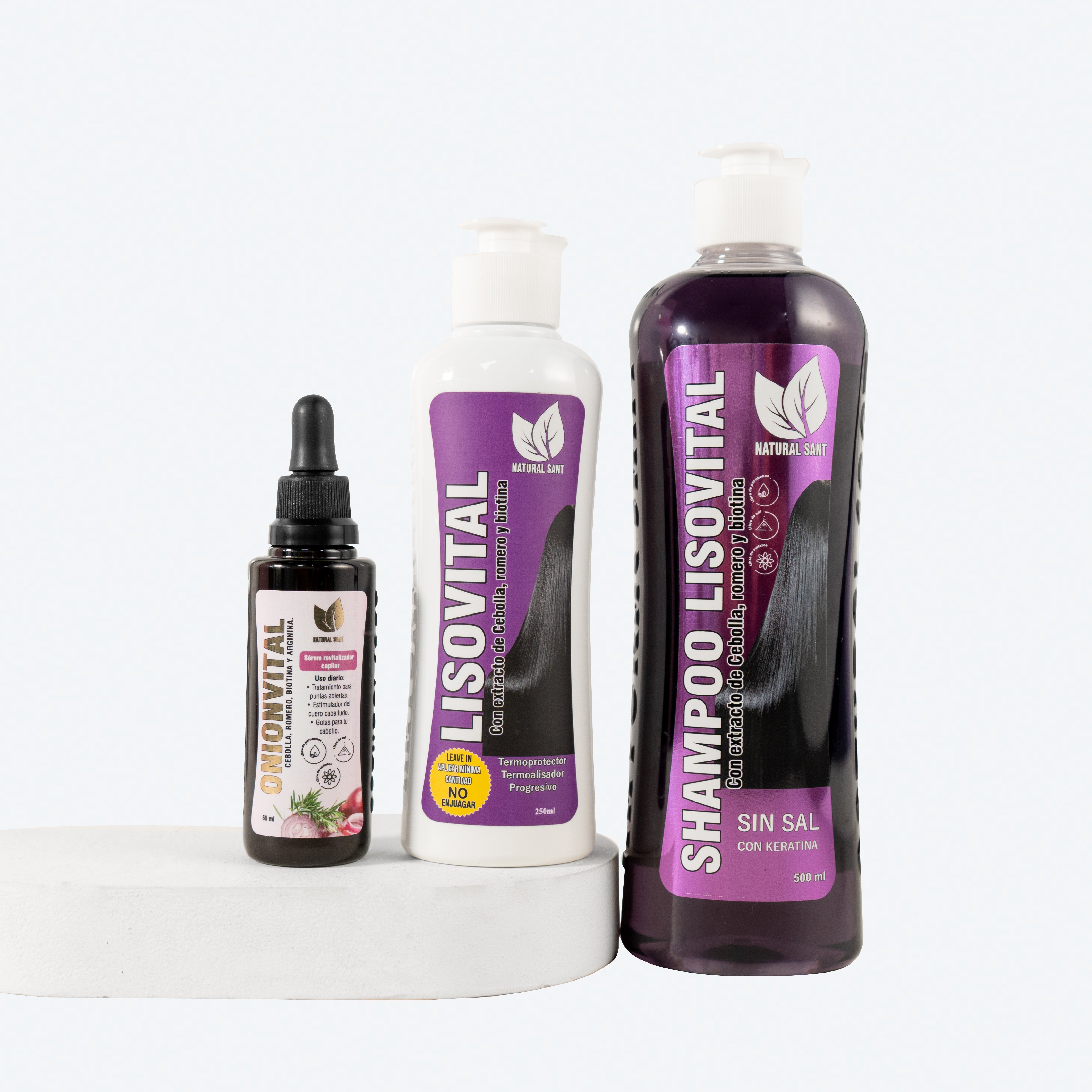 Combo Liso y Crecimiento Capilar Natural Sant  1. Set LISOVITAL – Termoprotector y Termoalisador ProgresivoEl cuidado completo que tu cabello necesita. Formulado con extractos naturales de cebolla, romero, biotina y keratina, ayuda a revitalizar, fortalecer y estimular el crecimiento, mientras protege del calor de planchas y secadores. Ideal para mantener un cabello liso, suave y saludable. 2. Sérum Capilar ONIONVITAL Natural SantRevitaliza profundamente tu cabello y cuero cabelludo con su fórmula concentrada de cebolla, romero, biotina y arginina.Diseñado para favorecer el crecimiento saludable, nutrir desde la raíz y fortalecer la fibra capilar, dejando tu cabello más resistente y lleno de vida.  Usalos juntos para potenciar el crecimiento, mantener tu cabello protegido, y lograr una melena fuerte, brillante y saludable.